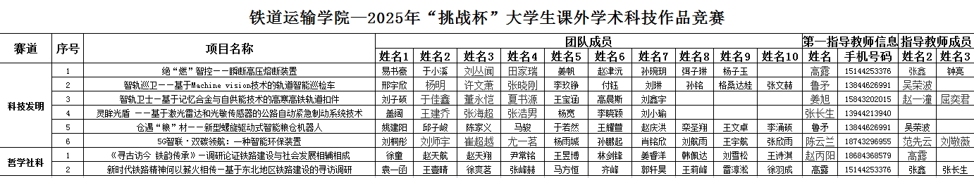 根据《关于组织开展吉林铁道职业技术学院2025年“挑战杯”大学生课外学术科技作品竞赛的通知》要求,按照赛制要求铁道运输学院团委组织了2025年“挑战杯”大学生课外学术科技作品竞赛。通过自愿申报、组织评审组评审,根据评审结果,拟推报8个项目参加校赛,现予公示: