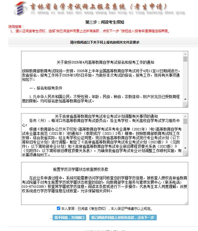 按照吉林省高等教育自学考试要求,报考时间:2026年3月5日至3月16日(每日开网时间为9:00—16:00)3月16日16:00网报系统将自动关闭,逾期不再补报。流程如下: