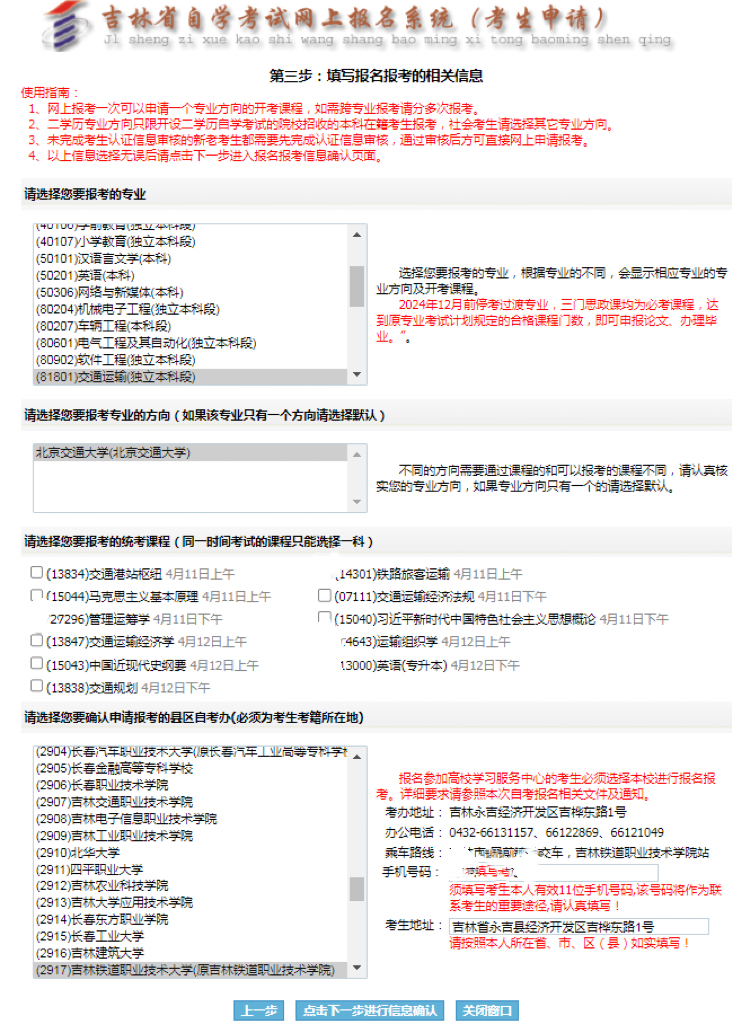 第四项是“请选择您要确认申请报考的县区自考办”,说明:必须为考生考籍所在地1.吉林铁道职业技术大学学生默认2917吉林铁道职业技术大学2.社会考生属吉林市昌邑区考试的默认为202昌邑区,属吉林省其他县区的点击当地县区名称);