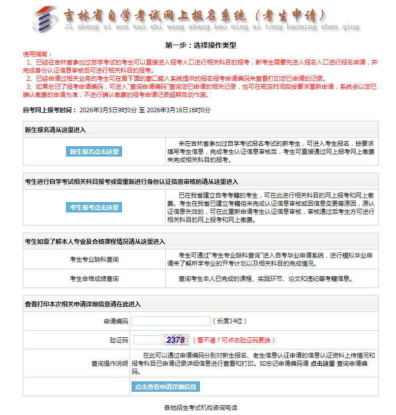 1. 考生在“吉林省自学考试网上报名系统”中进行报名、报考,网址:https://zkadm.jleea.com.cn/zk_bmsq。考生也可通过吉林省教育考试院官网(http://www.jleea.edu.cn)考试项目里自学考试中的“高等教育自学考试网上报名”链接进入。