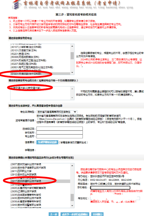 第五项是“请选择您要确认申请报考的县区自考办”,选填“2917吉林铁道职业技术大学” ;