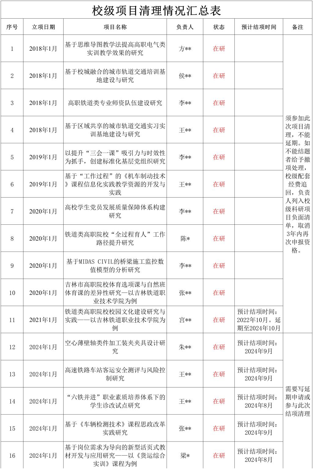 根据《吉林铁道职业技术大学校级科研项目管理办法(试行)》(吉铁校发〔2025〕119号)规定,应在研究周期内可以申请延期,但不超过一年。但仍有部分课题远超出结项时间(超期未结项名单如下表所示),本着对学校科研工作健康发展和对项目负责人高度负责的态度,请表中的科研项目负责人参加2026年校级课题结项验收,对于2021年(含)以前立项的项目,必须参加此次验收,如不能结题者给予撤项处理,校级配套经费追回,负责人列入校级科研项目负面清单,取消3年内再次申报资格。2024年1月立项的科研项目需要写延期申请或参与此次结项清理。此次项目清理工作上交材料时间截止到2026年3月31日。电子版材料发送至科研处邮箱:jtdkyc@163.com.