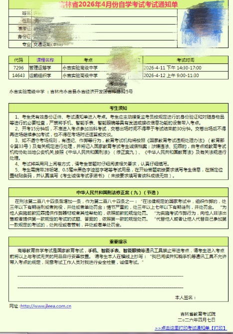 7.永吉招生考试服务中心要求考生自行打印考试通知单一份。