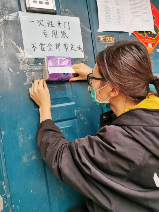 张闯同志:病毒不传播,疫情定可防。吉林市船营区光华园小区。接触传播是新型冠状病毒传播的一大方式,住宅区单元门把手是接触人群最多的公共物品。张闯老师为防止病毒通过接触传播,在单元电子门上放置了抽取式纸巾,目的是用抽取式纸巾阻隔住户与单元门把手的直接接触,进而起到防止病毒传播的目的,为小区住户提供了极大便利。