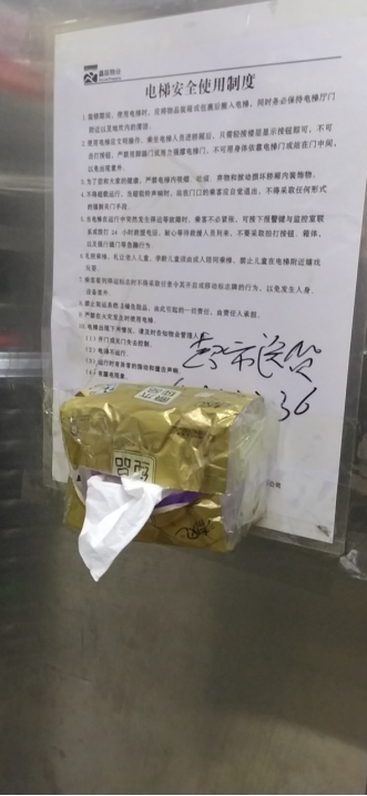 李景华同志:防护疫情、人人有责。单元楼的住户们上上下下都要乘坐电梯,尤其的电梯按键,一天要被不同的人按上好多遍,如果万一有些携带病毒的人按了电梯,其他人也按了电梯,回家没有及时洗手,极有可能被传染上肺炎病毒,为了预防新冠肺炎疫情进一步扩散,效仿其他小区的做法,自己在卢瓦尔小镇G11-2单元的电梯内拿胶带把一包纸巾贴在电梯间墙上,鼓励大家在按电梯间的时候抽取卫生纸,避免手指与按键直接接触,起到防疫和保护安全的作用。