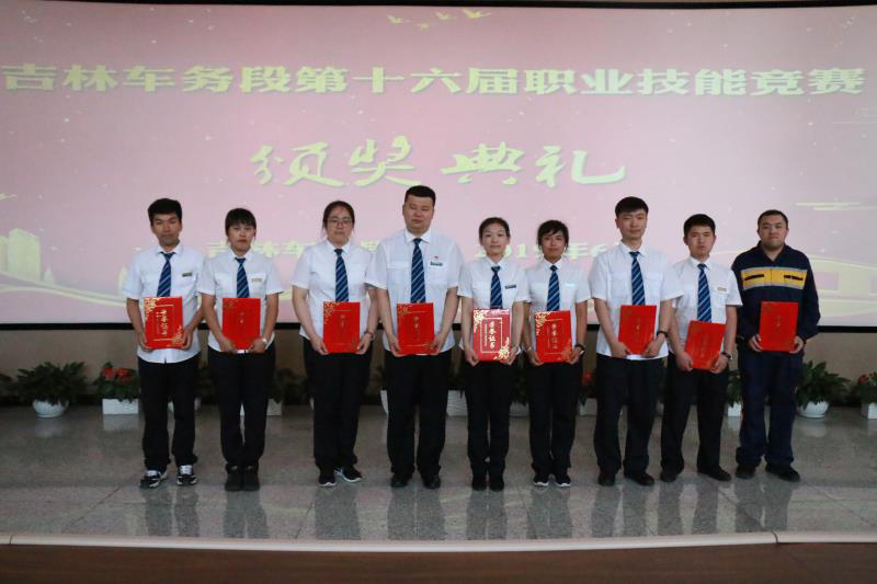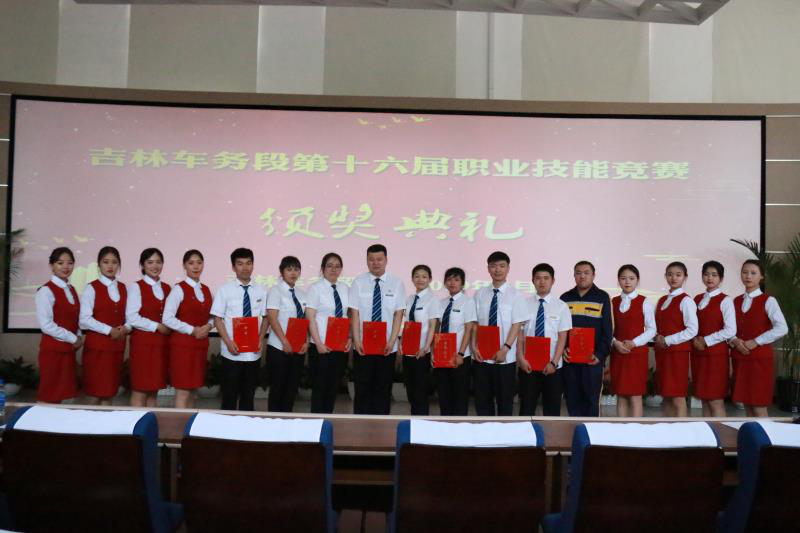 为落实沈阳局集团公司学习小东站“一点都不能差,差一点也不行”活动精神,进一步激发干部职工学标、对标、达标的积极性,吉林车务段于6月中旬举行第十六届职业技能竞赛,经过近一周的激烈角逐,全段共45名选手脱颖而出。6月14日在吉林车务段江北职工培训基地进行表彰,车务段全体领导班子、中层干部出席颁奖典礼。铁道运输学院铁道运营教研室教师李慧欣作为指导教师、高速铁路乘务专业2017级徐冰冰、文佳杰等八名学生担当本次典礼的服务、礼仪、引导工作。