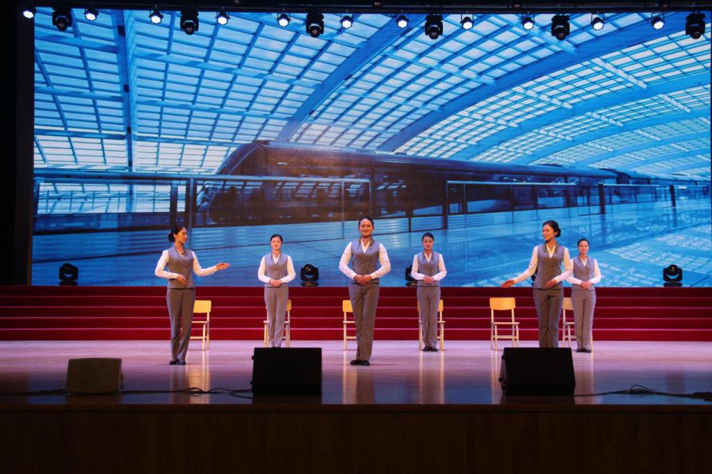 在大赛开始前由动车队助理工程师白莹带领动车队乘务员进行了铁路客运服务礼仪展示,并为比赛选手和现场观众对铁路旅客运输服务质量规范进行了生动讲解。随后由高铁乘务教研室王宇老师进行了教师礼仪展示。展示完毕后正式进入比赛环节,分礼仪展示和演讲两个环节。各参赛队伍按比赛要求将行姿、蹲姿、站姿、递接、鞠躬礼、握手礼等技能融合于小短剧中,并以“我与礼仪”为主题进行演讲,各参赛队伍端庄的仪态、优雅的举止、得体的手势,让在座观众被其散发出的职业魅力所折服,良好的表现得到了评委们的一致好评。通过激烈角逐,高铁乘务1601-02班“东方雅仪”代表队夺冠。