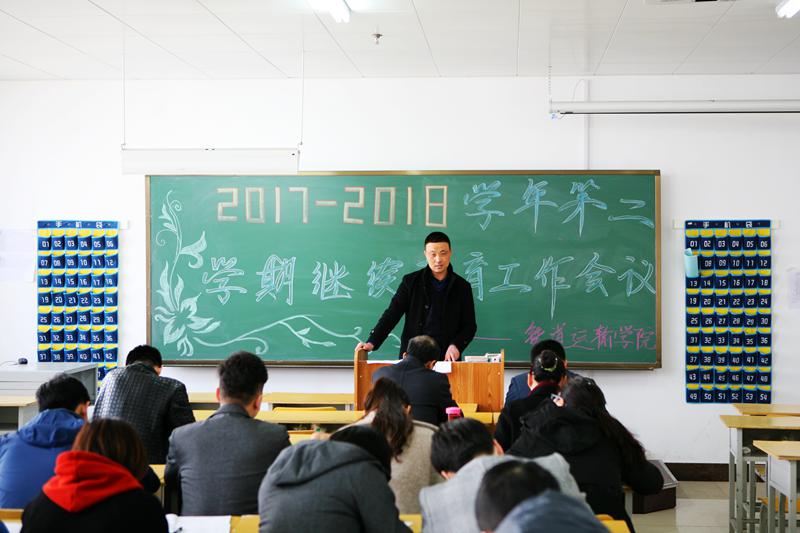 为贯彻落实学院继续教育工作会议和李欣副院长讲话精神,铁道运输分院于4月12日,在教学楼915室召开2017-2018学年第二学期继续教育工作会议。分院党总支书记盛继前、院长于伯良、副院长吴荣波、办公室主任刘士局、学办主任孟家辉、团委书记黄乐乐以及全体继续教育助学班主任参加了会议,会议由学办主任孟家辉主持。