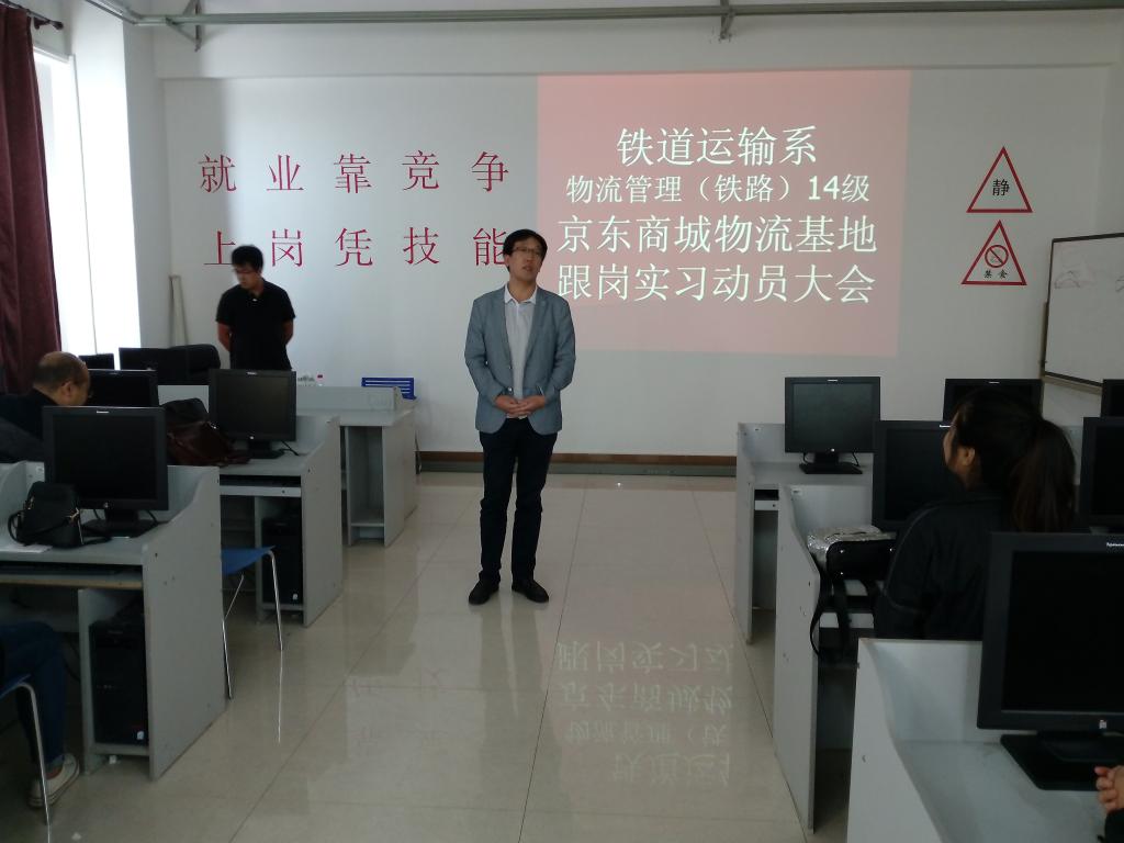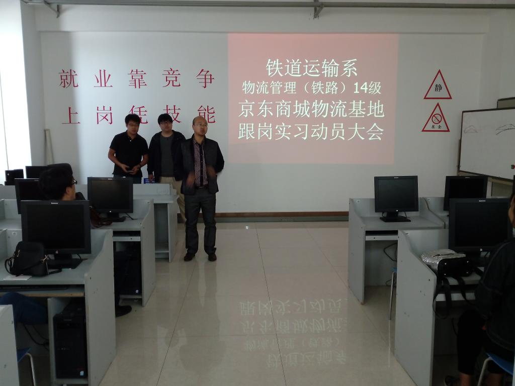 2016年9月28日9点30分,铁道运输系在实训楼2205实训室召开物流管理(铁路)14级京东商城物流基地跟岗实习动员大会。参加本次会议的有京东商城华北物流中心人力资源部经理赵伟华、铁道运输系副主任王笑然、跟岗实习指导教师张建东、14级物流管理班主任管清美以及14级物流管理(铁路)专业57名实习学生,会议由铁路物流管理教研室主任于兆宇主持。