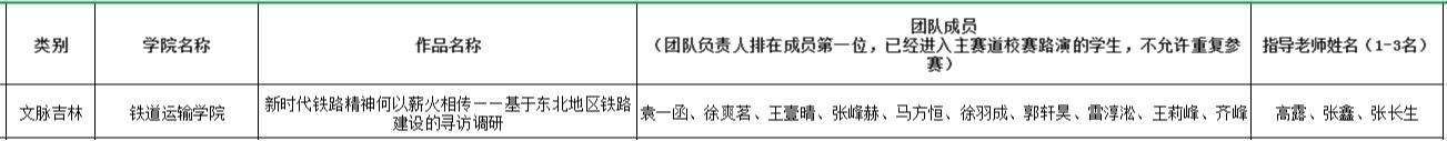 根据《关于组织开展吉林铁道职业技术学院2025年“挑战杯”大学生课外学术科技作品竞赛的通知》要求,学院按照赛制组织了铁道运输学院2025年“挑战杯”大学生课外学术科技作品竞赛“文脉吉林”社会调查专项赛。通过自愿申报、组织评审组评审,根据评审意见,拟推报1个项目参加校赛,现予公示: