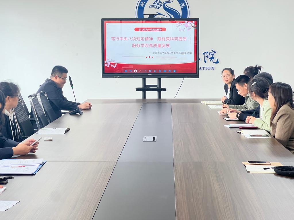 为深入推进全面从严治党,强化师德师风建设,提升教科研能力,5月7日,铁道运输学院教工党支部在会议室606开展“笃行中央八项规定精神,赋能教科研提质,服务学院高质量发展”主题党日活动。活动聚焦“不担当不作为”问题整治与教科研能力提升,通过专题学习与业务融合,激发党员教师干事创业的内生动力。