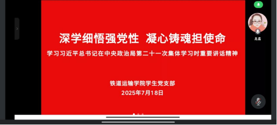 为深入学习贯彻习近平新时代中国特色社会主义思想,加强党员思想政治教育,7月18日,铁道运输学院学生党支部利用线上开展了“深学细悟强党性 凝心铸魂担使命”主题党课,组织全体党员认真学习习近平总书记在中央政治局第二十一次集体学习时的重要讲话精神。此次活动由学生党支部书记高露主持,全体学生党支部成员参加。