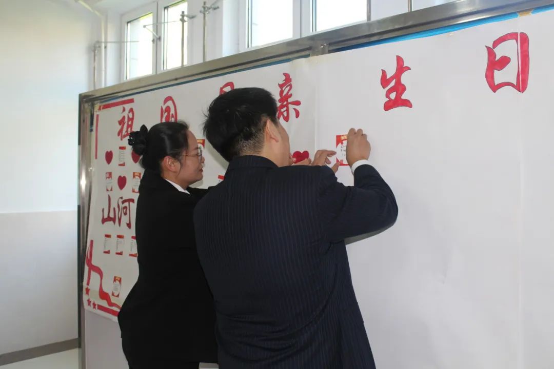 展板上一句句真挚的祝福语跃然眼前,简短而有力的话语饱含着同学们对祖国深深的热爱与祝福。