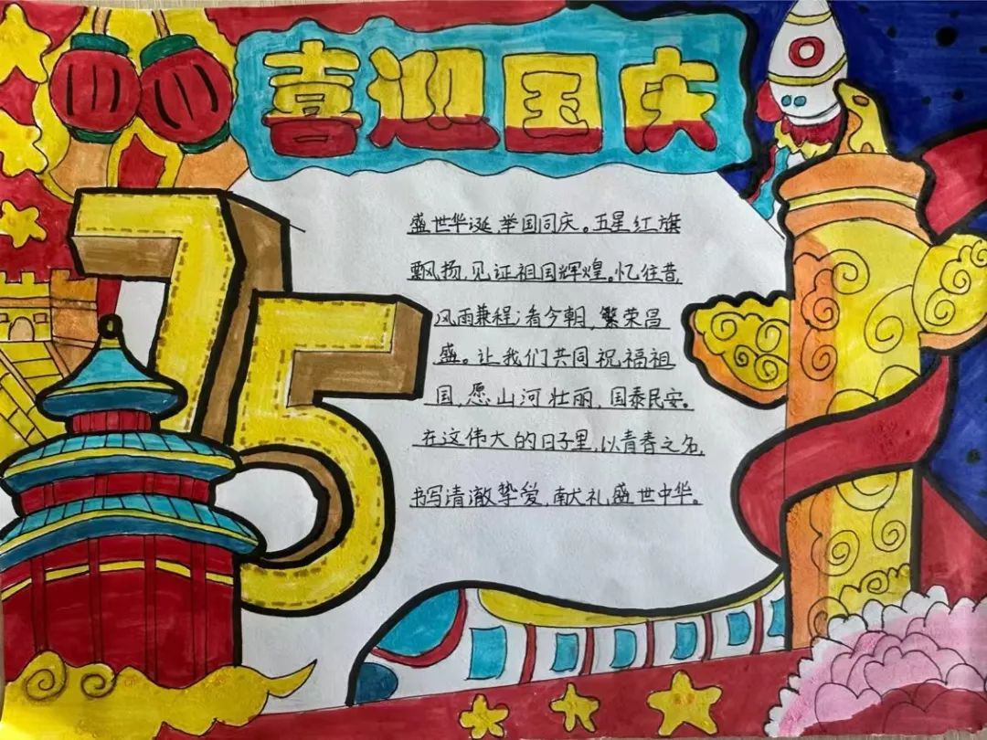 同学们用手中的画笔勾勒出祖国的壮丽山河书写下对祖国的深情祝福!在手抄报的制作过程中,同学们充分发挥自己的特长。有的同学用细腻的笔触描绘出祖国的壮丽山河,如雄伟的长城、奔腾的黄河、巍峨的泰山等;有的同学用生动的文字记录下祖国的辉煌成就,如科技创新、航天壮举、体育荣耀等。