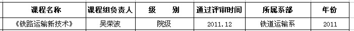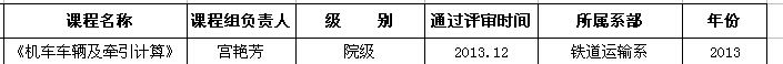 课程名称 负责人 级别 课程立项-结项时间 所属部门 车站调车工作 谢立宏 院级 2016.12-2018.12 铁道运输学院